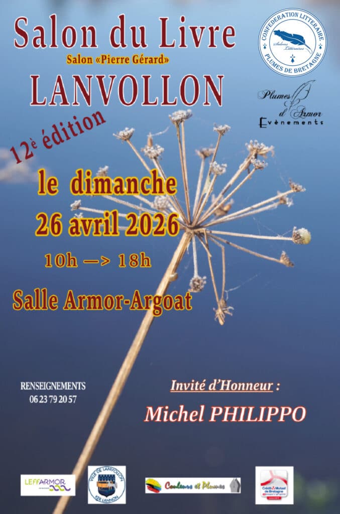 L’association Plumes d’Armor présidée par Xavier Pierre, organisera son prochain salon littéraire le dimanche 26 Avril 2026, à la salle Armor Argoat à Lanvollon, de 10h à 18h. Il aura pour invité d’honneur Michel Philippo, il sera accompagné de 35 auteurs.